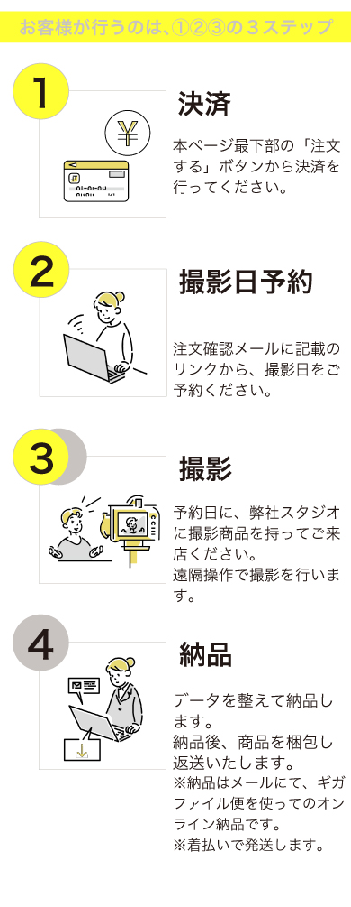 まずはご注文(決済)いただき、専用フォームにて商品を発送しての撮影の旨、ご依頼くださいませ。