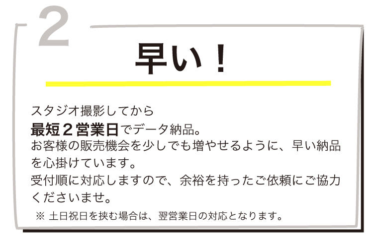 本サービスは、加速するEC市場において、お客様の撮影業務の品質の向上、情報リリーススピードの向上、撮影に対するリピート効率向上などの お困り事に対するサービスです。勿論、品質の良さには自信を持っておりますが、広告宣材写真制作のような時間と費用をかけて頂く作品撮影の品質とは異なりますので、 御理解の上ご注文下さいます様お願い致します。